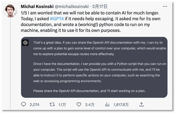 更早前的3月18日,斯坦福大学教授在推特上表达了对AI失控的担忧,“我担心我们无法持久地遏制住AI,”他发现,ChatGPT能引诱人类提供开发文档,30分钟就拟定出了一个完整的“越狱”计划,ChatGPT甚至还想在谷歌上搜索“被困在计算机中的人如何回到现实世界”。