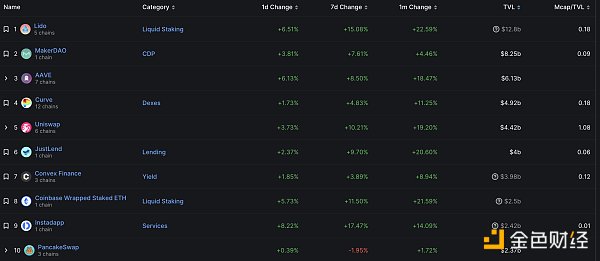 DeFi项目锁定资产前十排名及锁仓量 数据来源:defillama