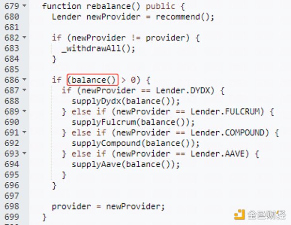 7. 随后,攻击者调用yearn: yUSDT Token合约的rebalance函数,该函数会将当前池子的代币提取出来,并质押到另一个收益更高的池子中,由于第2步操作,合约会将USDT和USDC提取出来,添加到收益更高的池子中,但当前合约仅有bZx USDC iToken,也只能提取出USDC,提取出来后将复投到其他USDT池子,此时复投将跳过。