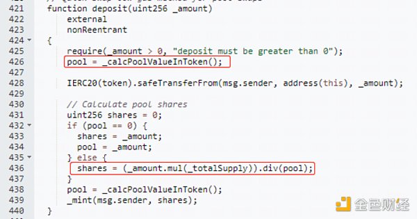 3.接着攻击者调用yearn: yUSDT Token合约的deposit函数质押了90万Tether: USDT Stablecoin,该函数会根据质押量为调用者铸相关数量的yUSDT,计算方式与池子中各种代币余额有关,如下图,此时为攻击者铸了82万的yUSDT。