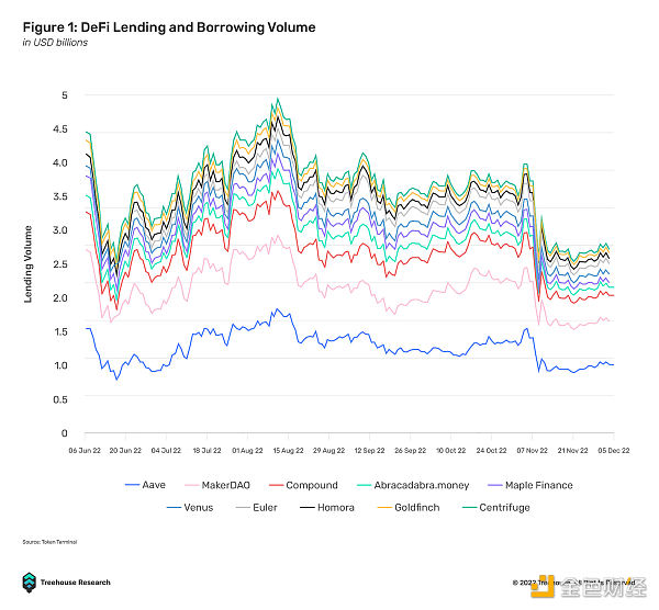 目前,截至 2022 年 12 月 5 日,DeFi 借贷协议的累计 TVL 为 US$13.96B,过去一年的每月借贷量从 US$9.37B 到 US$32.46B 不等。尽管这一数字即使在最近的市场收缩期间也一直保持稳定,但与 TradFi 市场相比,这个货币市场的规模仍然相形见绌。