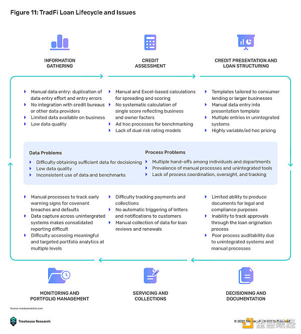 因此,获得 TradFi 贷款不仅昂贵,而且耗时。数据显示,平均一周内只有大约 7% 的 TradFi 贷款得到处理,多方参与会导致贷款成本激增。此外,在与借款人有现有关系的金融机构申请新的信贷额度可能仍需要再次通过整个 5C 审查周期。所有这些流程的运营成本很可能会在最终的贷款定价中由借款人承担,因为 TradFi 贷款(至少是合法贷款)被老牌金融机构高度垄断。因此,总计的成本很可能由借款人在总贷款定价中承担。