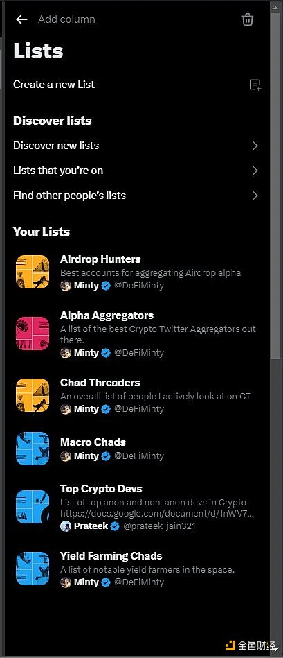 你可以将关注的 Kol、标签添加到一个列表,让你可以在一个页面中随时了解最新动态。
