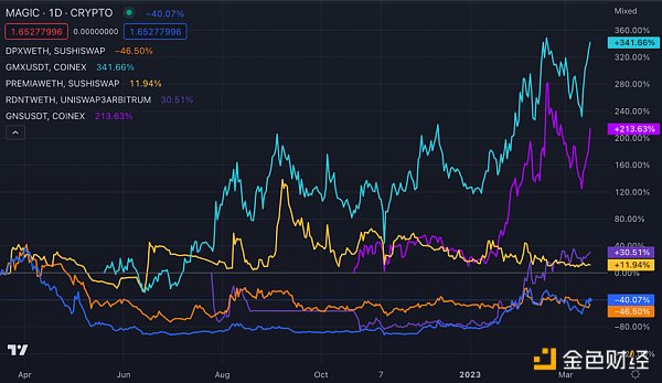 除了结构性流动之外,在未来几周和几个月内,有一些基本的理由可以看好基于Arbitrum的代币。在ARB激励措施的推动下,L2上的项目应该看到收入、用户和其他核心KPI的增加,因为用户蜂拥而至,资本流入L2。此外,这些代币也应该从更广泛的 "L2交易 "中受益,因为围绕Arbitrum的个人增长故事和进一步确认L2作为加密货币卓越的扩展解决方案的兴奋在交易者中建立起来。