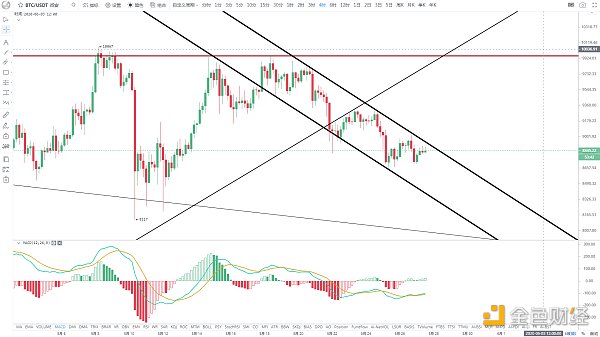 4小时依旧下降通道内运行,通道上沿阻力8950美金,这个位置也是4小时潜在双底的颈线位,强势突破,短线才会继续上攻,上方CME合约缺口上沿9100附近依旧还未补上,后续依然有回补的需求,不过在未重新站回30日均线前,反弹依旧逢高减仓或者做空为主,日线整体仍是空头趋势,MACD指标依旧空头趋势,反弹的力度和空间是有限的,冲高后还有掉头回落的风险,下方支撑区8500-8600,跌破回撤至8000甚至7700区域都有可能,目前量能萎缩,上涨或者下跌都比较乏力,短期区间波动为主,多观望少操作。