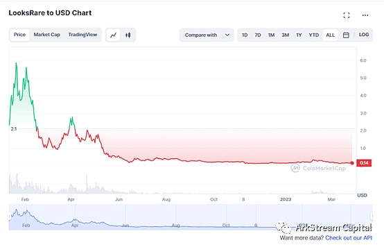 LooksRare后续的币价表现与交易量表现证明了交易挖矿的失败。