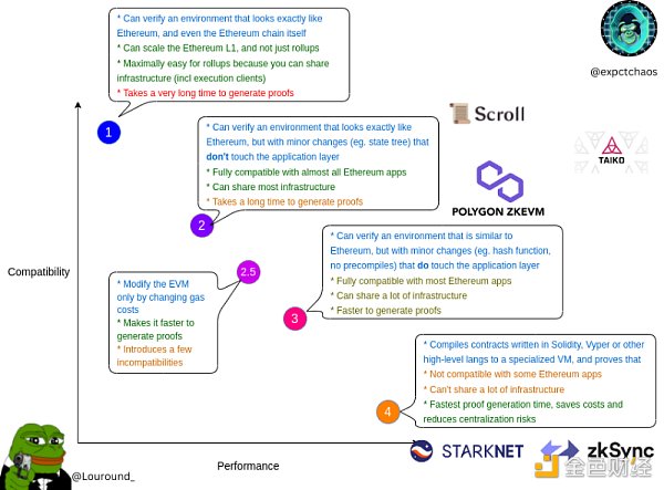 Vitalik Buterin 指出,共有 4 种不同类型的 zkEVM rollup,从类型 1 受益于完全的 ETH 等价性但降低了性能,到类型 4 则相反。