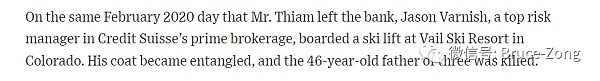 这位JASON VARNISH是瑞信大宗经纪业务的顶级风险经理,大宗经纪业务就是比尔黄的总收益互换交易本来应该归属的部门。JASON的死亡日,也就是2020年2月13日,是“瑞士信贷何以沦落至此:一排树墙引起的血案”里面提到的因丑闻辞职的CEO THIAM离开瑞信的办公室的同一天。需要指出的是,当初THIAM得到了瑞信CEO的工作,正是因为瑞信知道自己的风险管理不足,想要THIAM把原来在PRUDENTIAL的管理风险的经验带来瑞信。THIAM还没有来得及大展宏图,就含恨离场了。因此2020年2月13日瑞信在欧美两个大陆,同一天失去了两个风险管理的重要人员,一个是有强烈风险管理意识的CEO,一个是大宗经纪业务的顶级风险经理,前者的原因是一排树墙,后者的原因是雪场缆车。
