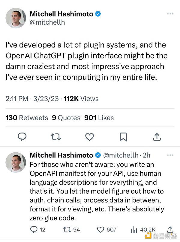 「OpenAI 设计的插件系统是我这辈子见过的最疯狂的系统。如果你要给它写插件,你并不是去写这个插件的程序,你是写一个关于插件的描述,用你的自然语言,然后 GPT 来帮你生成这个插件。」