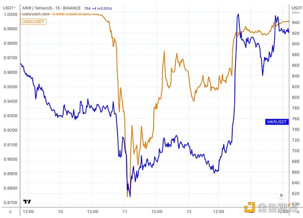 图:USDC 和 MKR 在脱锚危机期间价格变化