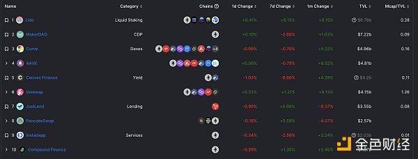 DeFi项目锁定资产前十排名及锁仓量 数据来源:defillama