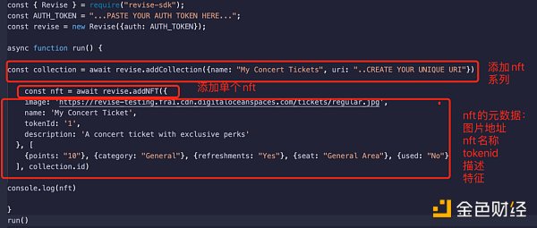 加入初始 NFT,和初始的 Collection,创建一个 index.js 的文档。下图创建了一个叫做 「my concert tickets」的 NFT 集合,并且储存了 tokenID 为 1 的 NFT 的元数据,包括图片地址,名称,描述,和特征。 这些元数据也是该 NFT 的参数,后面可以进行参数的更新。