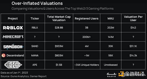 元宇宙大热催生地产泡沫。与 Web2 相比,Web3 世界中地产的市场估值和活跃用户之间仍然明显差距。尽管顶级 Web3 项目的市场估值下降 71%,但其人均估值(以每位用户算)仍是游戏 Roblox 的 200 倍。