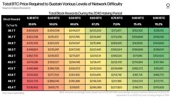 基于当前的挖矿经济学以及挖矿费用以美元计价的事实,比特币的安全负担在未来几个减半周期内不应该成为一个问题。然而,铭文活动带来的交易活动增加以及交易的聪/字节的上升很可能会进一步延迟安全负担问题的出现。在下表中,我们试图量化需要的 BTCUSD 汇率来维持 2024 年减半之后各种网络难度水平,并且如何增加总交易费用会影响所需的比特币价格。