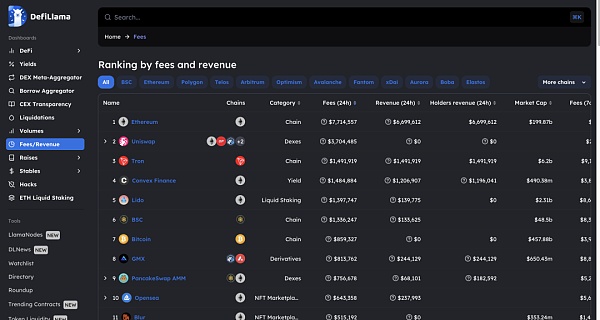 2.协议收入查询:DeFi Llama 可以查看当下各个defi协议的收入,国库收入,活跃用户数,市值等一系列变化。20年defi summer的时候,大家判断一个defi项目是否有价值,主要是通过看其TVL变化,而经过熊市的洗礼之后,现在,判断一个defi项目是否有价值,就要看这个协议是否赚钱。