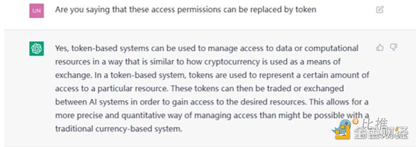 如果 AI 要相互交易,他们会用法定货币还是数字货币进行交易?我问 ChatGPT 这个问题,它回答说,与传统货币相比,用代币对数据访问进行量化定价是一个更好的解决方案。