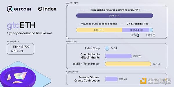 Gitcoin 官方举了个例子,假设 ETH 稳定在 1700 美元,质押收益稳定在 5% 左右,那么一年下来 1 单位的 ETH 将可获得 0.05 ETH 的质押收益。如果用户选择持有 gtcETH,那么 0.05 ETH 中的 0.03 ETH 将归用户所有,剩余 0.02% 将被剥离,其中 0.0175 将流向 Gitcoin Grants 用于捐增,剩余 0.0025 则将作为费用流向 Index Coop。