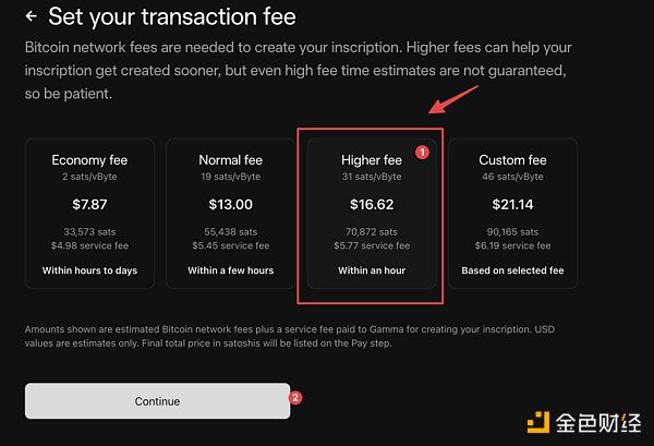 轻触继续,选择费率,一般我们选 Higher fee 以保证铸造尽快成功。