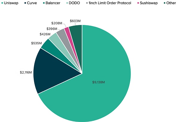 前两大 DEX 占据市场主导地位,占DEX总交易量的 90% 以上。在本节中,我们将概述以太坊上两个最大的 DEX:Uniswap 和 Curve Finance,它们的工作原理以及经济模型。