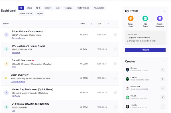Footprint同样很重视开发者社区,在搜索栏可以搜索并查看其他用户生成公开的图表和看板,也可以复制其他用户的看板为自己所修改。