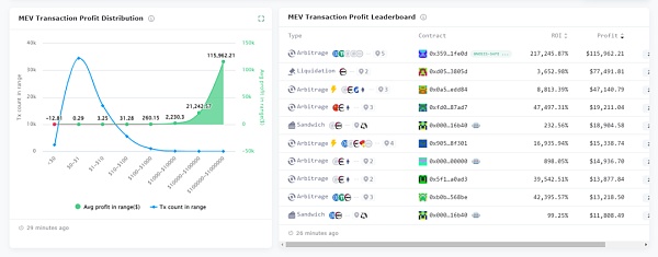 MEV合约/地址数据:中观数据层次,包括该地址发起的MEV类型及对应的损益统计、投资回报率、经常交易代币、接受MEV交易的矿工比例及近期该地址参与的所有MEV交易列表。如果该地址是三明治交易的受害者,还可以查询到其在查询时段内被攻击的次数、损失金额及对应的三明治交易和攻击者。