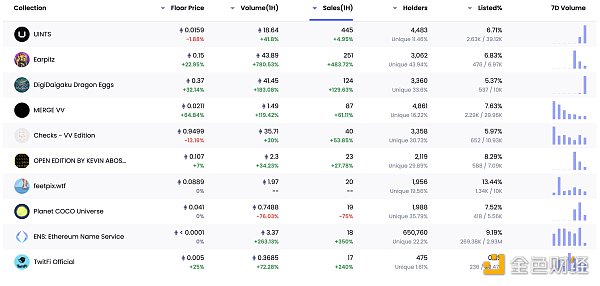 24小时NFT交易量、交易量前十项目 数据来源:Coinmarketcap