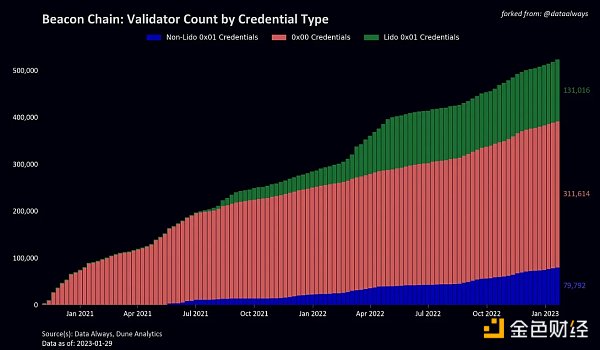 多数分析师假设两类验证者(0x00、0x01)具有一致的特征,但这是一个很大的错误。当我们查看下图中信标链存款时,我们看到所有创世验证者都是在没有设置 0x01 凭证的情况下创建的,这严重扭曲了数据。