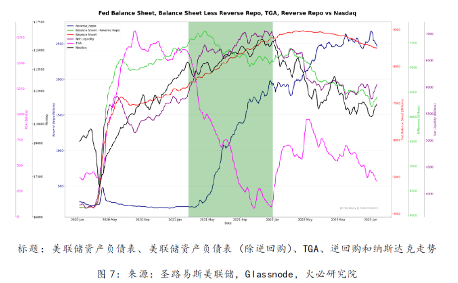 据图 7 所示,绿色阴影位置是美联储把 TGA 帐户的 1.6 万亿花到几乎为 0 的时间段,抵消了突然升高的逆回购并充盈了凈流动性,有助 纳斯达克大涨。