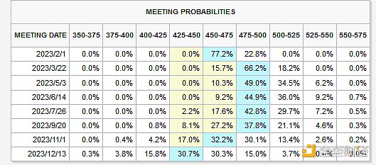 2023 年,根据 CME FedWatch Tool,市场认为可能性最高的路径为, 2 月加息 25 bps, 3 月加息 25 bps,随后维持利率在 4.75% ~ 5% 直到 2023 年 3 季度末(维持高利率约半年时间),首次降息 25 bps 出现在 2023 年 11 月。