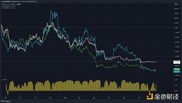除了相关性极高外,加密强相关股票的波动甚至高于 BTC 本身,具备较大弹性;但 COINBASE 上市以来并未表现出比较优势(可能由于上市不久即进入熊市),时间上也几乎同步波动。