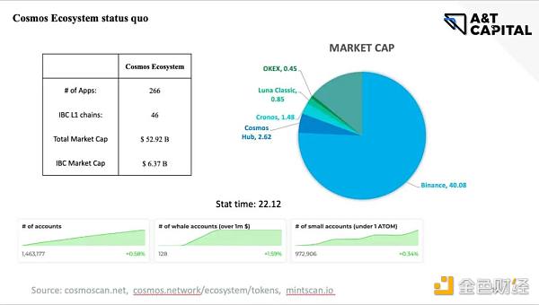 Crypto整体市值对比 —— 2022年12月统计随着2022后半年Crypto恶性事件频发,整体Crypto市值进一步下跌,Cosmos生态总市值相比Terra崩溃时却有所回暖,生态整体受Crypto熊市影响显著小于其他alternative L1。Cosmos内部IBC头部公链格局暂未大变,但市值显著降低,其他Cosmos新L1市值增长迅速。可以预期随着Cosmos未来IBC链更迭加大,Cosmos头部公链格局将发生变化。Cosmos生态整体活力较好,值得布局。