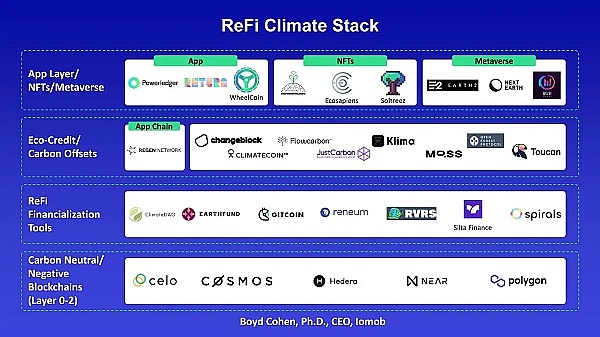 目前,有非常多的 Layer-1 和 Layer-2 区块链明确会促进和支持低碳经济,甚至创建奖励金以鼓励 ReFi 项目部署在其区块链上。包括 Cosmos、Internet Computer、Hedera、Topl、Polygon、Celo、Near、Algorand 等。