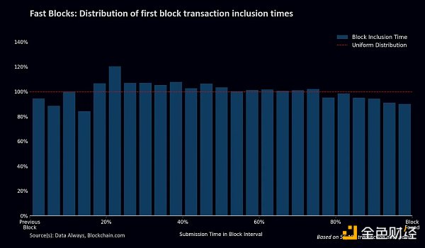 与此形成鲜明对比的是,如果我们查看快速区块,则提交时间的分布要均匀得多[5]。这表明在快速区块中的时间竞争没有意义。