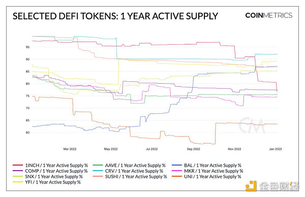 查看 DeFi 代币的所有者数量也有助于评估采用率和兴趣。在 DAO 的背景下,去中心化的所有者基础可能是有利的,因为它意味着更广泛的选民基础,对问题的看法也是呈现多样化的。大多数代币在 2022 年的链上所有者数量呈缓慢上升趋势,然后在 11 月显着上升,因为许多用户将他们的代币转出了交易所。