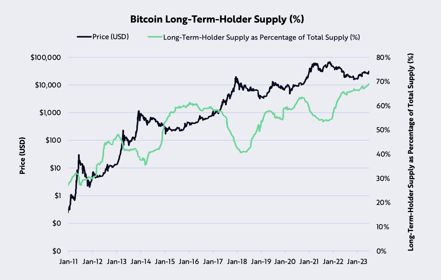 Ark 表示,根据 Ark 的分析,近 70% 的比特币流通供应量至少一年没有变动,这表明持有者基础不断增强,长期比特币投资者的信心也在增强。