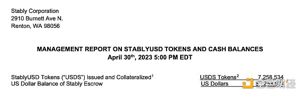 包括 Bitcoin 的 Ordinals 协议在内,Stably USD 已经在 12 条不同的链上发行,但整体规模并不大。根据 The Network Firm 公司为 Stably 提供的独立会计师报告,截至 2023 年 4 月 30 日,Stably USD 的发行量一共 7258534 ,储备账户余额为 7258974 美元,储备金略高于 USDS 发行量。