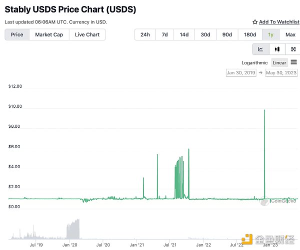 Stably 过去发行的稳定币 USDS 的价格并不足够稳定。根据 CoinGecko 的数据,过去一年 USDS 最高涨至 10 美元,最低跌至 0.6 美元。