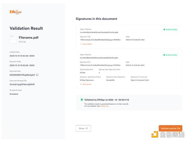 证据提交。应制定关于证据提交的具体规则,以确保各方提交的证据是相关和真实的。应优先考虑通过 EthSign Signatures 等产品签署和正确核实的合同和协议,该产品可以提供详细的信息和文件历史清单,包括签名生成、签名人的地址和其他相关信息。