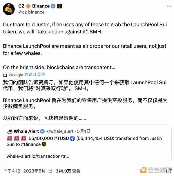 3)再结合 Justin Sun 曾在 Binance SUI 的 LaunchPool 期间将 5600 余万枚 TUSD 转账到 Binance,遭到 CZ 警告。