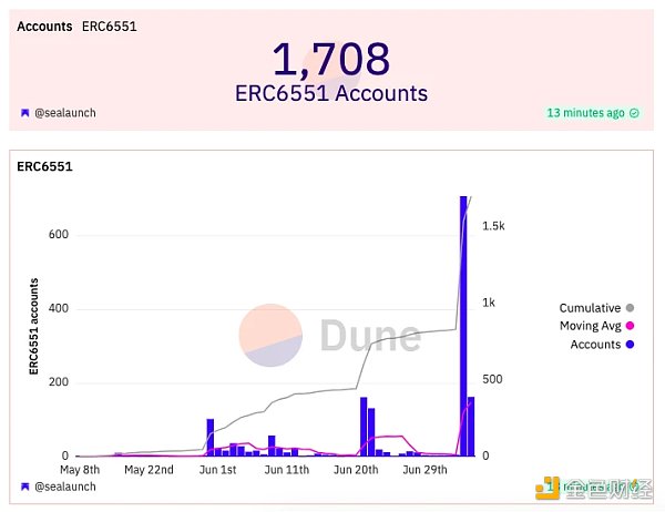 虽然 ERC-6551 热度正盛,但从链上数据来看,当前以太坊主网之上基于该标准所创建的账户数量实际上并不算多。根据数据分析平台 sealaunch.xyz 于 Dune 所编绘的图组,截至发文,基于 ERC-6551 所创建的账户总数仅有 1708 个,其中近半(709)系 7 月 4 日单日创建。