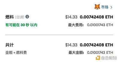 接下来我们需要在钱包内确认相关交易,以当前 45 GWEI 左右的 gas 情况,大概需要 14 美元左右。