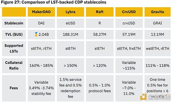 CDP 是通过在智能合约中存入和锁定抵押品(在本例中为 LST)并因此铸造稳定币来创建的。由于代币发行量增加带来的高 APY,围绕新协议的炒作很多,但 MakerDAO 等 OG 协议仍然是明显的市场领导者,从存入的 LST 中铸造了 4.844 亿 DAI。与 DAI 铸造量相比,铸造量显着高出 5,730% eUSD (Lybra),尽管抵押率最高,费用相对较高。