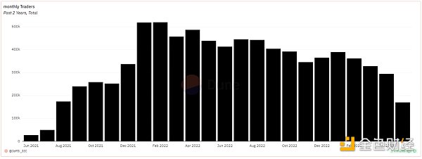 图:NFT 月活 Trader 数量, Resource:https://dune.com/queries/2670914/4440079,数据截取时间 2023 年 6 月 27 日