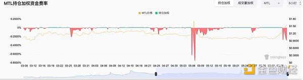 我们可以观察到,MTL 的合约资金费率在 5 月 6 日出现异常,但轧空过快一天结束。然后 6 月 6 日再次出现异常,后期一度高达 -1.8% 的极值。更重要的是, 6 月 6 日起合约持仓量大幅攀升,持仓量 6000 万美元,很接近流通市值 8000 万美元。合约成交量 8000 万美元,接近现货成交量 1.6 亿美元的 50% 。这波轧空行情 MTL 在一周时间内上涨了 2–3 倍。