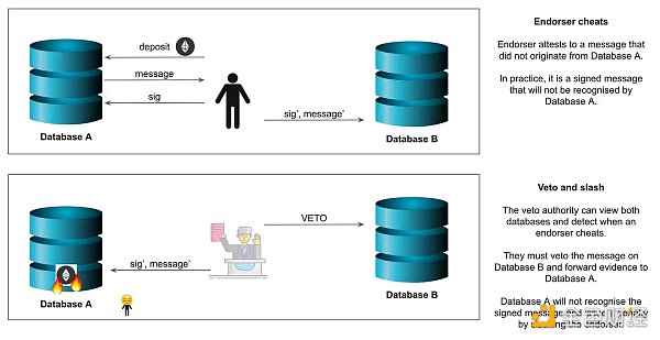 否决权。负责交叉验证签名消息是否源自数据库 A,以此保护数据库 B。