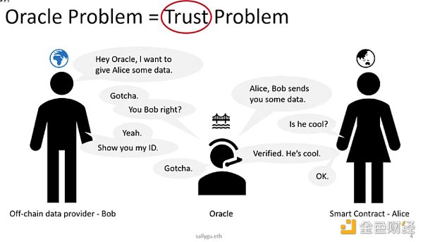 值得指出的是,这里预言机解决的关键问题:不是如何从现实世界获得信息(事实上任何人,你我他,都可以把链下的数据上传到链上),而是如何帮助区块链去信任来自现实世界的信息(就算你我他把链下的数据传到链上也没用,不会有人相信,进而也不会有人会采用,这里当然还涉及到诚实节点的问题)。