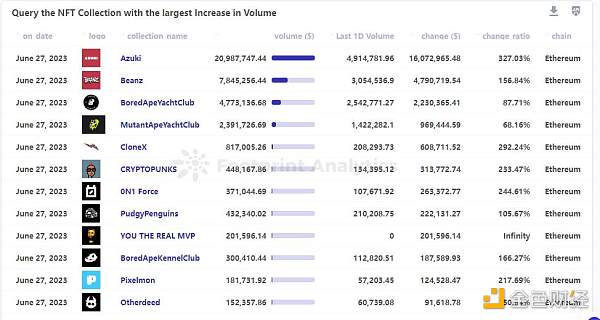 6 月 27 日交易量达到 6,145 万,这在很大程度上归因于 Azuki,单个系列交易量就达到了 2,000 万。