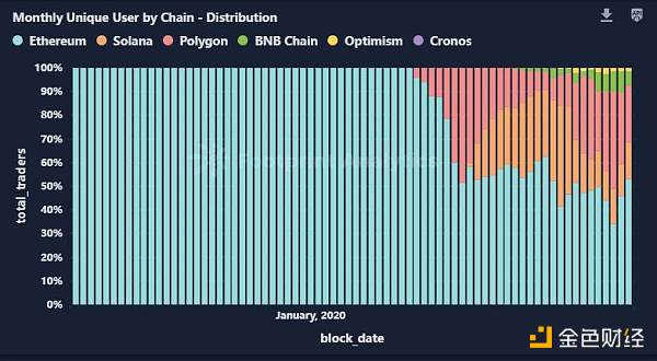 在过去三个月中,以太坊不仅保持了其在 NFT 交易中的主导地位,而且独特用户的比例也在逐渐增加。尽管其他公链有低 Gas Fee 的优势,但大部分用户仍然倾向于使用以太坊进行NFT交易。