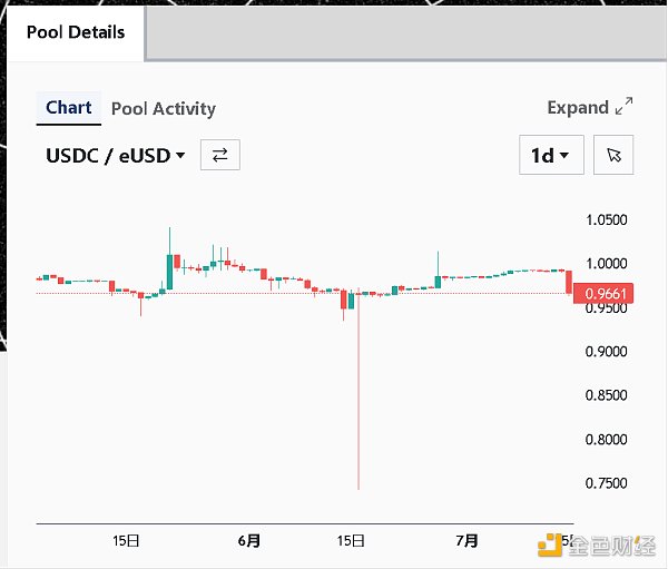而就在我写完这部分内容草稿以后的几个小时后(7月16日),eUSD已经上涨至1.03USDC。当然,随着eUSD的价格上涨,套利空间会显著被缩小,eUSD的向上脱锚也不是没有限制的。