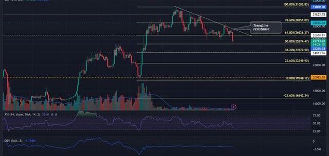 但如果BTC收回61.8%斐波那契黄金水平,多头可能会重新获得影响力。尽管如此,如果多头清除趋势线阻力路障,他们只能向前推进并触及2.85万美元。2.85万美元之后的下一个关键阻力位是2.98万美元。